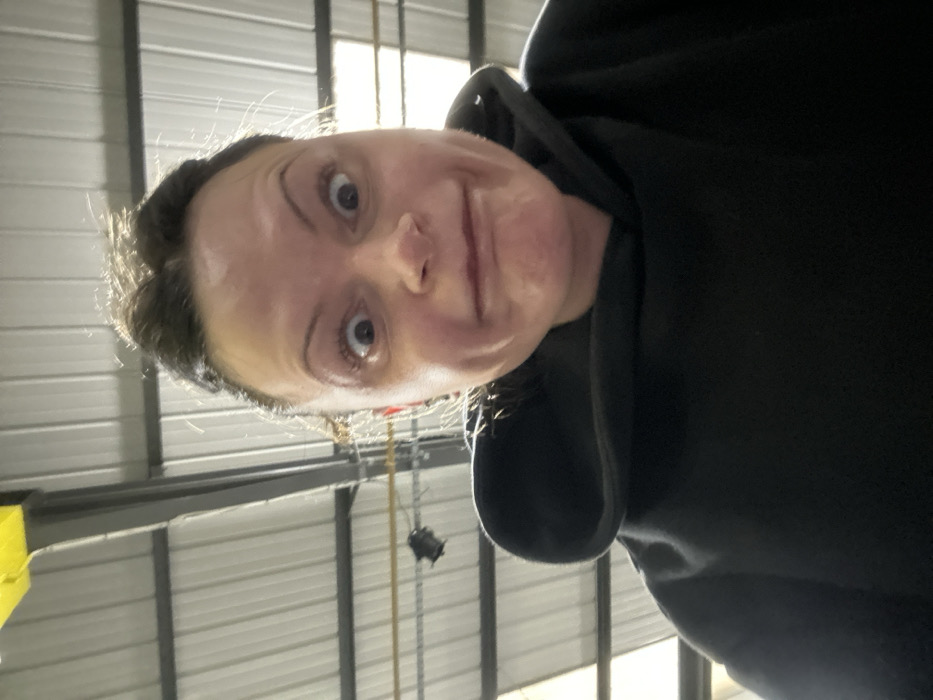 An adult female is captured in a close-up, head-and-shoulders portrait, centered in the frame. Her dark hair is pulled back, revealing her face with widely opened eyes and dilated pupils, directed straight at the camera. Her mouth is pursed and slightly downturned at the corners, creating a deliberate comical or exaggerated expression. She is wearing a plain black hooded sweatshirt, with the hood visible around her neck and shoulders. The background indicates an indoor industrial or commercial environment, characterized by a high ceiling composed of light-colored corrugated metal panels. Structural elements include dark metal support beams and a prominent yellow beam running horizontally across the upper left portion of the frame. Several skylights are visible in the ceiling, allowing natural light into the space. A dark, indistinct object, possibly a light fixture or piece of equipment, hangs from the ceiling in the mid-left background. This scene is located in a commercial or industrial building within Tunbridge Wells, United Kingdom.