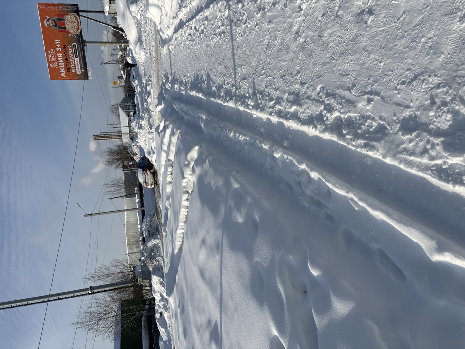 A snow-covered street scene. A billboard is visible on the left featuring food and Cyrillic text. Tracks run through the snow, indicating passage. Buildings and trees are visible on the left behind a fence. Power lines stretch across the sky. The sun is shining, casting shadows on the snow. A few parked cars can be seen.