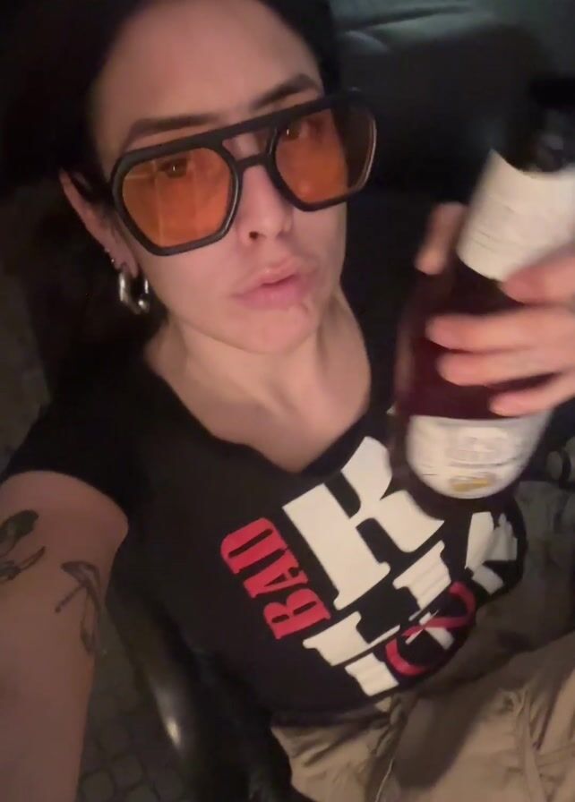 woman seated, holding a bottle of beer and taking a drink. She's wearing orange-tinted sunglasses, a black t-shirt with a white and red design, and light-colored pants. She also has hoop earrings and tattoos on her arm and hand. The beer bottle has a white label with the words "APOLO CERVEZA" printed on it. The background includes a door with graffiti, a coat rack with clothes, and a tiled floor. There's music playing loudly in the background.