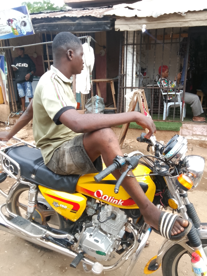 This image captures an outdoor scene in Ukwu-Abwa, Nigeria, depicting a street or commercial area. In the foreground, a dark-skinned male individual, with short dark hair, is seated sideways on a yellow "Qolink 150" motorcycle. He is wearing a light olive-green polo shirt with black trim on the collar and sleeves, dark denim shorts, and black and white striped slide sandals on his feet. His right leg is positioned over the motorcycle's handlebars, while his left arm extends slightly backward, supporting his weight. The motorcycle features a black seat, chrome exhaust pipe, and visible engine components. The background consists of two adjacent storefronts or small buildings with corrugated metal roofs. To the left, another dark-skinned male is visible standing in a doorway. He wears a black hooded sweatshirt with "ACID" printed in white on the front and light blue denim shorts. He holds a white object, possibly a smartphone, in his hands. A white sign with blue text and graphics, advertising what appears to be a washing service or appliances, is mounted near this doorway. To the right, behind metal security bars, a third individual with red hair is seated on a white plastic chair inside a shop. This person wears a multi-colored patterned long-sleeved top and light-colored trousers, looking downward at a device held in their hands. A bare light bulb hangs from the ceiling inside this shop, and a patch of green artificial turf is visible on the ground directly inside the entrance. Partially visible to the right of this person are the lower legs and feet of a fourth individual, seated out of frame. The ground in the immediate foreground and surrounding the motorcycle appears to be unpaved dirt. The overall lighting suggests an outdoor daytime setting.