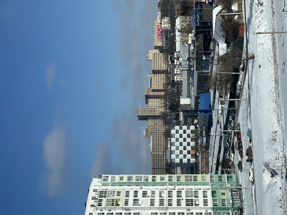 The image depicts a winter city scene in Kharkiv, Ukraine, specifically an elevated view looking towards the area of Freedom Square. In the foreground, a snow-covered landscape extends across the bottom, featuring a dark, narrow depression or channel running horizontally, with banks of snow. A few utility poles stand vertically. The mid-ground features a multi-lane road with several vehicles, including white, maroon, and blue cars, visible. Adjacent to the road is a fenced parking area containing numerous parked cars. Various commercial or low-rise industrial buildings are visible, some with blue-colored facades. A prominent modern building with a black and white checkerboard pattern on its facade, identifiable as the Sumy Market, is centrally located. To the left, a tall, multi-story modern residential building with white and light green panels and multiple balconies occupies a significant portion of the frame. The background is dominated by the massive, light brown Derzhprom (State Industry) building complex, characterized by its numerous windows and multi-tiered structure. Surrounding it are other urban buildings, some appearing older, and bare deciduous trees, indicative of winter. A tall, slender antenna-like structure rises above the city skyline. The sky is clear and bright blue with scattered, wispy white clouds. The presence of snow on the ground and roofs confirms cold weather conditions, likely winter. The scene is illuminated by sunlight, casting some shadows. No individuals are visibly present.