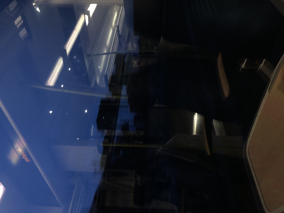 An abstract composition featuring reflections and interior elements within a train car