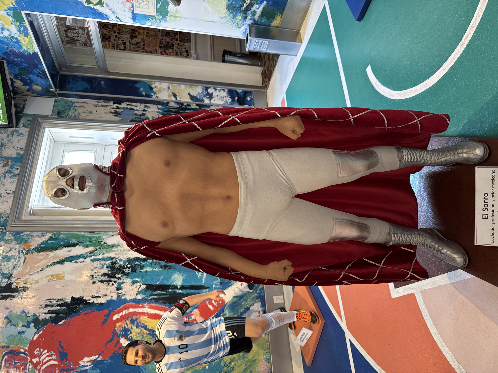 The image depicts a wax figure of "El Santo," a renowned Mexican luchador (professional wrestler) and actor, in a museum setting, possibly in Mexico City, Mexico. The figure is dressed in his signature silver mask, white wrestling tights, silver wrestling boots, and a red cape. He is striking a pose with clenched fists. Nearby, there is a statue of Lionel Messi, and a sign with the text "Lionel Messi." The background includes a painted wall with an abstract design in blue, white, and red hues, and flooring that seems to represent a basketball court with green and white markings. There are other visual elements like a trash can and various informational posters/signs in the background, indicating that this is a museum or similar attraction.