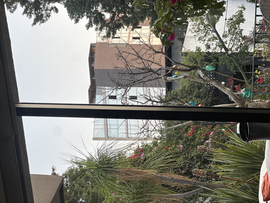 A view through a window showcases a building with mixed glass and brown brick facades. Green trees and a long-leafed plant fill the foreground, some with pink blossoms. Decorated branches with teal and green baubles curve across the frame. The sky is a dull gray. A black cylindrical object and white cloth are visible on the right.