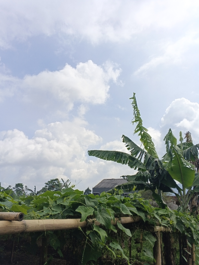 Lush greenery dominates the foreground, with climbing plants draped over a bamboo structure. Behind, a banana tree with tattered leaves stands tall. A glimpse of a gray roof appears amidst the dense vegetation. The scene extends to distant trees. The bright sky is filled with fluffy white clouds. The composition suggests a tropical or semi-tropical environment, possibly a rural or suburban landscape.