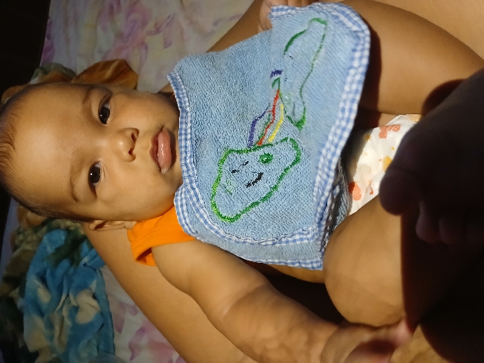 A baby wearing a blue bib with an embroidered cartoon cloud and rainbow lies in someone's arms. The baby is light-skinned with dark eyes and is wearing an orange shirt. A patterned diaper is visible. A hand obscures part of the scene on the right side. A blanket or sheet with a blue floral design is in the background. The lighting is bright but somewhat uneven.
