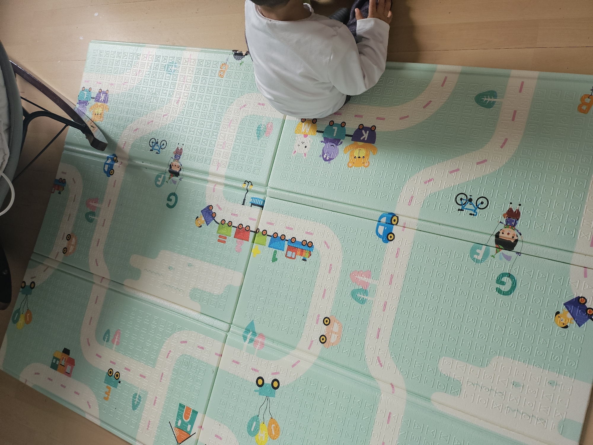 A child wearing a white long-sleeved shirt sits on a light green foam play mat, patterned with letters, numbers, roads, and cartoon vehicles