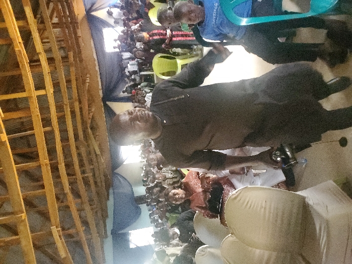The image portrays an indoor gathering in the city of Unknown, Unknown. An adult male, dark-skinned and of medium build, stands in the foreground, slightly left of center, wearing a dark-colored tunic and trousers. He holds a metallic object, possibly a camcorder or large microphone, with a wire extending downwards. His gaze is directed towards the right side of the frame. To his immediate left, a woman in a red and orange patterned traditional outfit is seated in a light-colored chair. To his right, a young boy in a blue t-shirt and dark trousers is seated in a light blue plastic chair. The background reveals a large assembly of individuals, predominantly adults, seated in rows of light-colored and plastic chairs. The environment features an exposed ceiling with wooden rafters and corrugated metal sheeting, partially adorned with blue and white fabric draping along the upper walls. The floor appears to be a light-colored solid surface. The assembled crowd suggests an audience attending an event or presentation.