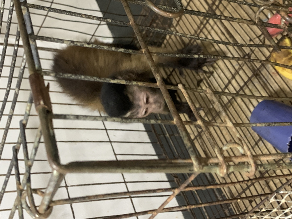 A Capuchin monkey is observed inside a rusty, metal wire cage