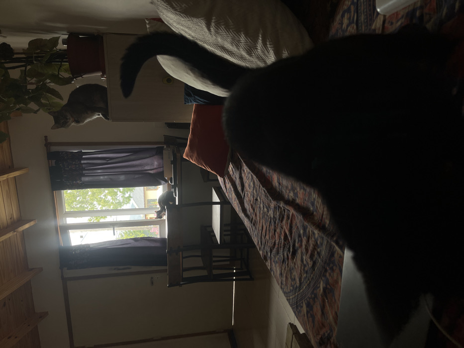 Two cats are visible. One cat is gray and perched atop a cabinet, near a potted plant. The other cat is mostly obscured by shadows, with only the tail clearly visible, and is positioned on a bed or couch with a patterned spread and pillows. A window with curtains provides a view outside, partially obstructed by a third cat, and a wooden ceiling is also visible.