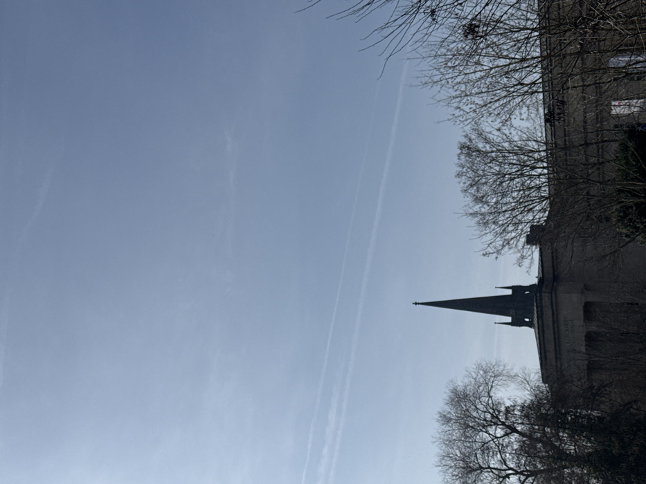 This image depicts an outdoor daytime scene in Bad Nauheim, Germany, featuring the Dankeskirche (Protestant Church) and surrounding environment. The upper two-thirds of the frame are occupied by a clear, light blue sky with faint, linear contrails visible in the upper mid-section. The lower third of the image is dominated by architectural structures and bare deciduous trees. A dark, slender spire, characteristic of the Dankeskirche, with a sharply pointed apex and smaller decorative elements along its lower shaft, rises prominently against the sky. This spire originates from a large, light-colored stone building exhibiting classical architectural elements, including columns and an inscribed frieze on its facade. The building's flat roof is visible around the spire's base. Bare deciduous trees with visible branch networks frame the structures, obscuring parts of the buildings on the left and right sides of the image. Their lack of foliage indicates a dormant season. To the right of the main church building, another section of a light-colored structure is partially visible, from which a white banner or sign with indistinct red markings hangs, partially obscured by tree branches. No individuals, vehicles, or active interactions are depicted within the scene. The lighting suggests ambient daylight, with no harsh shadows visible.