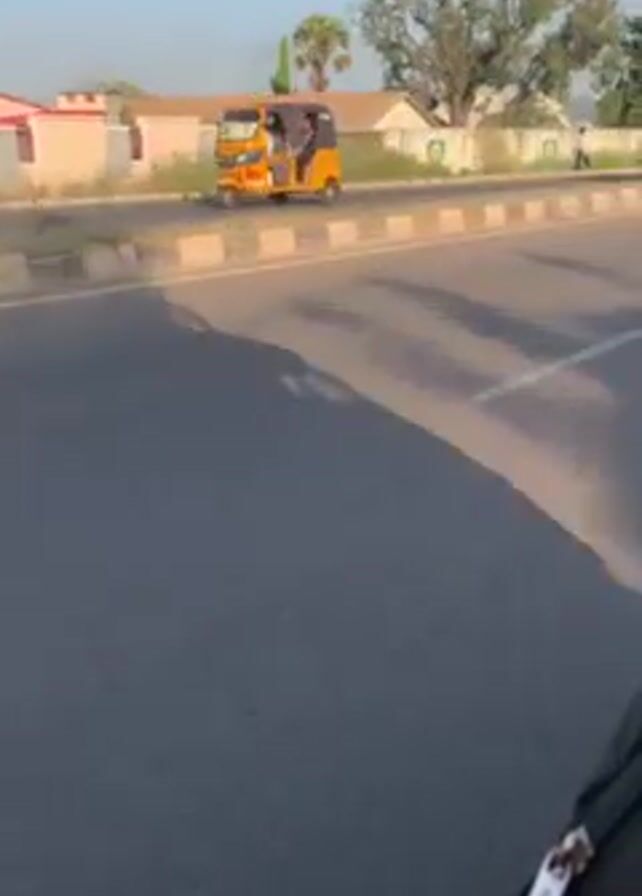 The video depicts a moving perspective from a vehicle on a paved road. The road has a white lane marking and is bordered by a low curb with a black and white pattern. On the other side of the curb is a low wall and some greenery. Tall trees line the background against a clear blue sky. As the vehicle moves forward, various signs come into view, including one advertising "Face ID" and another with "OPay" branding. Cars pass by on the opposite side of the road. A person can be briefly seen standing near the wall. The camera appears to be mounted inside the vehicle, with a portion of the interior visible at the bottom of the frame. The overall impression is that of traveling along a road in a suburban or semi-urban area on a clear day.