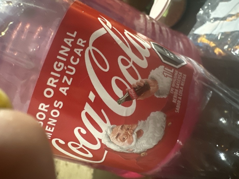 A plastic bottle of Coca-Cola is shown, the label is predominately red with the white Coca-Cola logo. The logo incorporates an image of Santa Claus holding a Coca-Cola bottle, and beneath him his head and upper body. In white writing on the red label is the phrase "Sabor Original Menos Azucar". A small hexagon with dark and light shading is visible on the label as well.