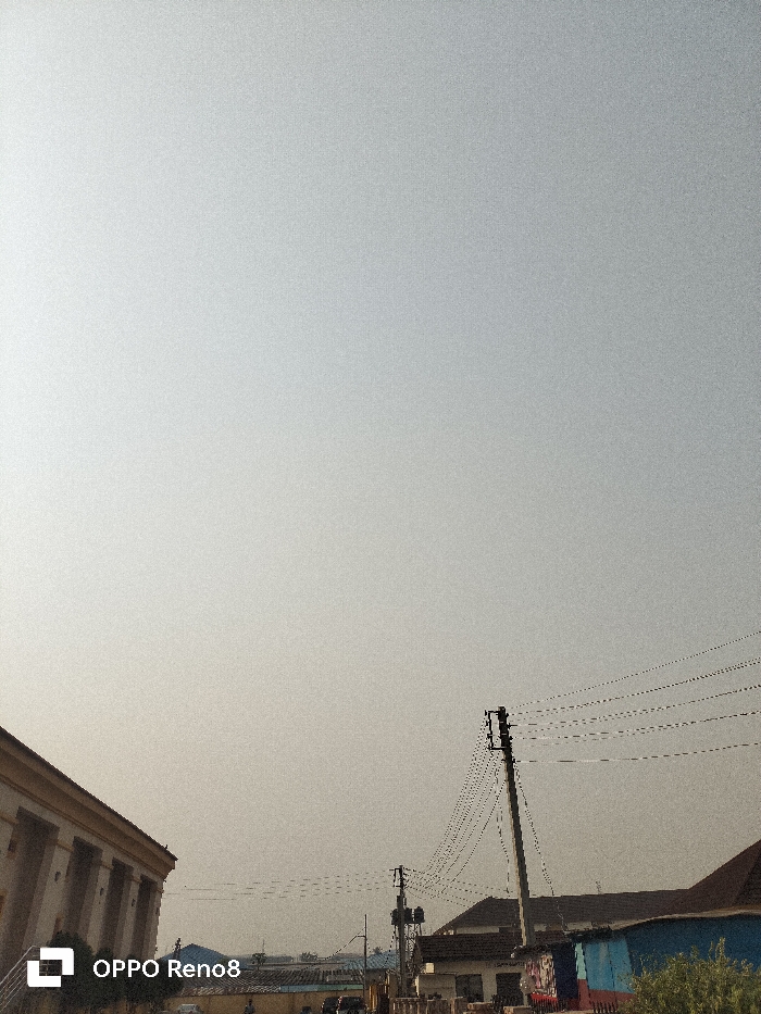 The image depicts an urban street scene in Lagos, Nigeria, under a bright, hazy, or overcast sky that occupies the upper 70% of the frame. The sky exhibits a light gray, almost white hue with visible digital noise. On the far left, a multi-story building with a light-colored facade, featuring prominent columns or pilasters and a substantial cornice, is partially visible. A small, green shrub is present near its base. The bottom-left corner contains an "OPPO Reno8" watermark. In the midground, several utility poles with numerous black electrical or communication wires are visible. The most prominent pole, a dark, vertical structure, stands on the right side of the frame, supporting multiple horizontal lines that extend across the mid-upper section. A second, shorter utility pole is visible further back and to its left. Below the utility poles, a collection of urban structures is present. On the far right, a building with a dark, sloped roof is partially visible. Immediately below it, a structure with distinct bright blue and red sections, possibly a kiosk or makeshift stall, is observed with some green foliage in front. Further into the midground, behind the utility poles, other residential or commercial buildings with varying rooflines and light-colored walls are discernible. A street or pathway runs horizontally across the lower portion of the scene. Indistinct figures, likely pedestrians, and a few partially obscured dark-colored vehicles are visible on this thoroughfare. No specific actions or interactions are clearly identifiable. The overall environment suggests a densely built-up urban area with typical street infrastructure. The exact location within Lagos cannot be determined from the visual information alone.