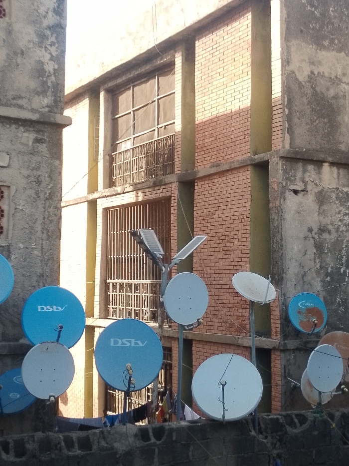 This image depicts an urban rooftop scene in Sabon Gari East, Nigeria, observed during daylight hours under sunny conditions. In the foreground, a dark, weathered concrete parapet wall partially obscures the bottom of the frame. Mounted on poles above and behind this wall are numerous satellite dishes of various types: at least three blue DStv branded dishes, approximately five plain white or light grey dishes, and one partially rusted blue dish. Positioned slightly right of center among the dishes is a solar-powered street lamp assembly featuring two rectangular solar panels and two downward-facing light fixtures on a central pole. Directly behind the satellite dishes and the solar lamp, laundry is visible hanging to dry on a line. In the background, two buildings are present. To the left, a portion of an older, weathered concrete structure with a small, partially visible window featuring a decorative white grating is seen. The dominant background structure is a multi-story building with a facade characterized by light brown brickwork, vertical olive-green or dark grey concrete columns, and horizontal concrete beams. The upper floor of this building features a large window with a metal security grille or balcony railing. The lower visible floor includes another window secured with a metal grille. Sunlight illuminates the brick facade, casting some shadows. No individuals are visible in the scene.