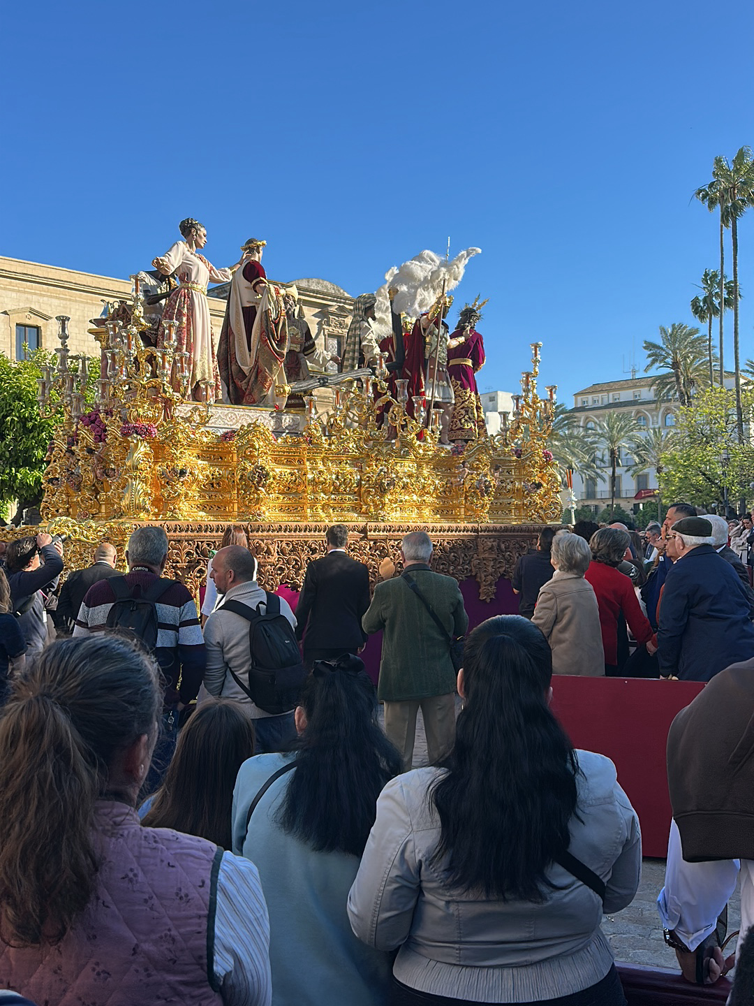 The image depicts a religious procession in Jerez de la Frontera, Spain. A large, ornate golden float carrying statues of religious figures is the focal point. The float is heavily decorated and positioned above a crowd of spectators. The crowd consists of men and women of various ages, most facing the float. Some individuals are taking photographs. The buildings in the background suggest an urban setting with palm trees. The sky is clear and blue.