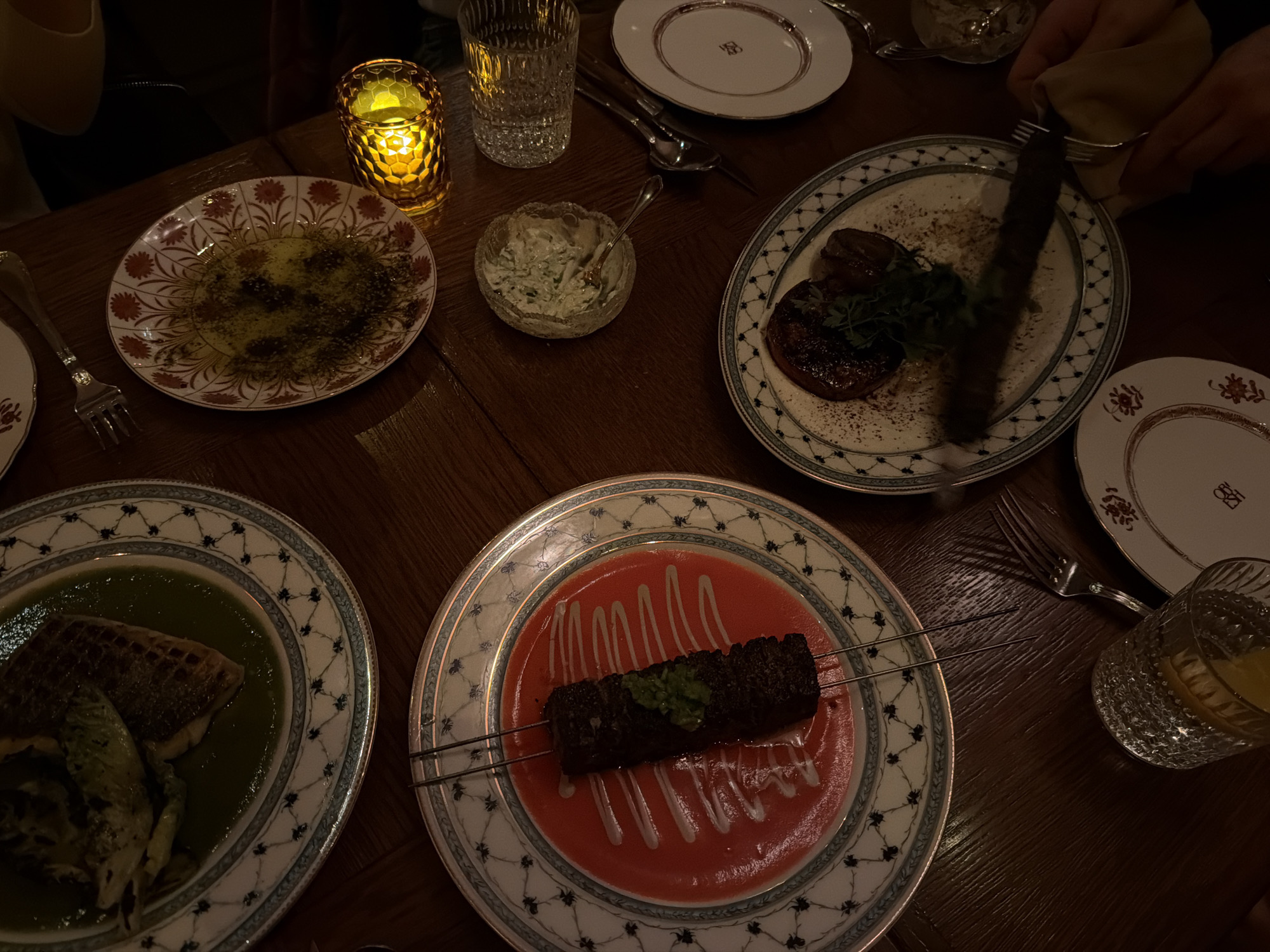 The image depicts a dining table in a restaurant setting. Several dishes are arranged on the table: one with what appears to be fish in a green sauce, another with a dark rectangular food item on a red sauce base, another with grilled meat and vegetables, and another containing a dark substance with floral patterns on the plate. A small bowl of white, creamy substance with green speckles is also present. Cutlery is placed next to the plates, and a glass of water and a lit candle are visible. The plates have distinctive patterns and designs, and some have a "B" logo. The table is made of wood. The photo was taken at a restaurant in New York City, United States of America.