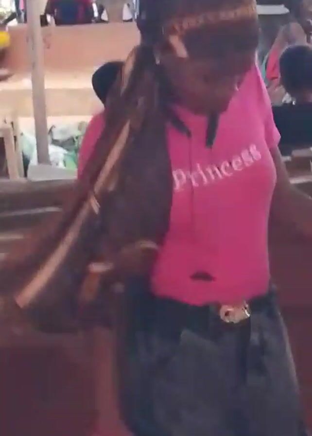 woman in a pink "Princess" t-shirt, blue patterned pants, and brown sandals, with a patterned wrap on her head. She is standing in what appears to be a market or public space, with other people visible in the background, including someone in a black hat and a person in a green shirt. There are metal rails or barriers present, and the general environment seems crowded.
