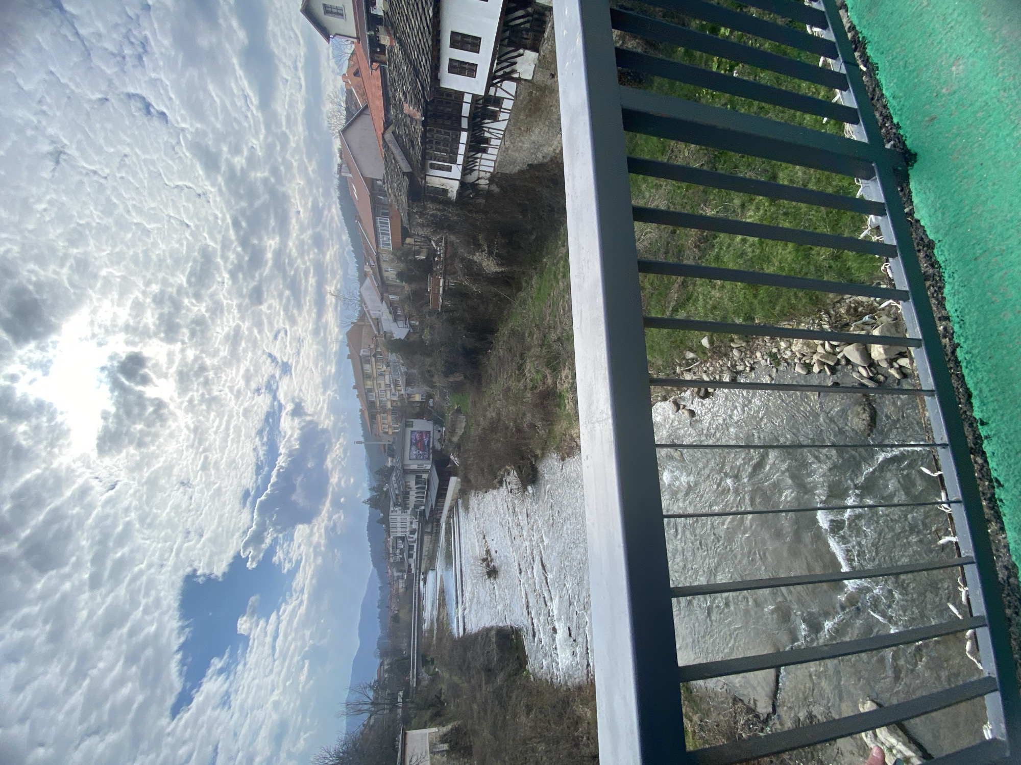 The image depicts a panoramic view of the Beli Osam River and its surrounding urban landscape in the city of Troyan, Bulgaria, captured from a bridge facing generally upstream. In the foreground, a dark grey metal bridge railing with vertical balusters spans the width of the frame, with a bright green, textured surface visible on the bridge deck in the bottom right corner. A person's hand is partially visible gripping the railing on the far left. The Beli Osam River flows beneath the bridge and extends into the midground, characterized by a moderate current, numerous rocks, and small rapids. Approximately mid-river, a small, vegetated island or clump of brush is visible. Further upstream, a series of low weirs or stepped cascades is present. The riverbanks are steep and covered with sparse, mostly dormant vegetation, including bare trees and patches of green grass, with exposed soil and rocks. On both sides of the river, various buildings constitute the urban environment. On the right bank, a row of traditional-style Bulgarian houses features white facades, dark timber framing, and dark-tiled roofs, appearing to be built directly into the bank. Beyond these, a mix of residential and commercial buildings with varied architectural styles and roof colors (predominantly red tiles) line the river and extend up the hillside. On the left bank, a collection of multi-story buildings, one featuring a large billboard-style advertisement on its side, is visible. Two additional bridges are discernible further upstream, spanning the river. In the distant background, rolling hills or mountains are visible under a partly cloudy sky. The sky above is largely covered by a dense formation of altocumulus or stratocumulus clouds, with bright sunlight breaking through and creating strong highlights, indicating a bright but possibly cool day. Patches of clear blue sky are also visible amidst the clouds. No people are explicitly visible in the scene beyond the partially seen hand in the foreground.