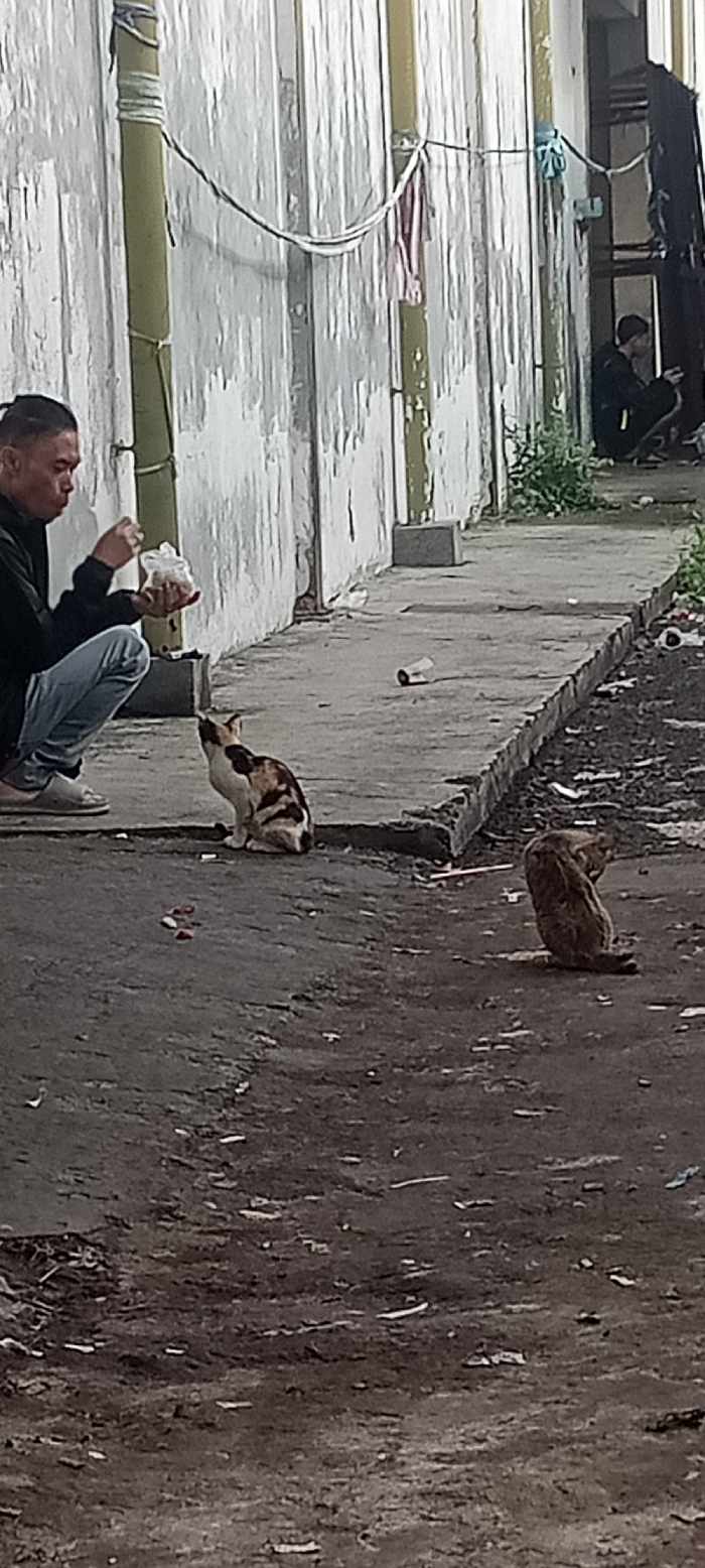 The image portrays an outdoor urban scene in Sulaeman, Indonesia. In the immediate foreground, a man with dark hair, pulled back into a small bun or ponytail, is squatting on a concrete platform. He wears a dark long-sleeved shirt, light blue jeans, and light-colored slide sandals. He holds a clear plastic bag or container, appearing to dispense food. Directly in front of him on the concrete platform is a calico cat (white, black, and orange/brown patches) sitting upright, looking towards the man. To the right and slightly further back, on a lower dirt/gravel ground, a second cat with dark brown or mottled fur is seated, facing away from the man. The background features a heavily weathered wall with peeling white paint and vertical greenish support poles, from which wires or ropes are strung. A raised concrete pathway or sidewalk runs parallel to this wall, exhibiting minor damage and containing a single discarded plastic bottle. The ground in the lower half of the image is dark, uneven dirt or gravel, interspersed with scattered small white fragments and reddish debris. In the distant background, on the right side, a second individual in dark attire is observed crouching within a dark doorway or recessed area, partially obscured by shadow. Small patches of green vegetation are visible near the base of the wall.