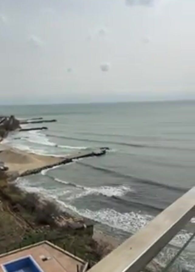 view from a balcony overlooking a beach and the sea. The balcony has a stainless steel and glass railing. Below the balcony is a small swimming pool. The beach is sandy with some vegetation along the coastline. The sea has small waves. The sky is overcast with some scattered clouds. There are buildings visible in the distance along the coastline. The camera pans slightly from left to right, revealing more of the balcony. There are no people visible in the video.