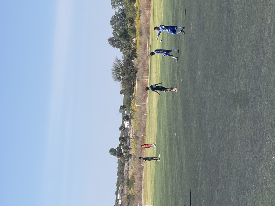 The image displays a soccer field in La Venta, Mexico, under a clear, bright blue sky