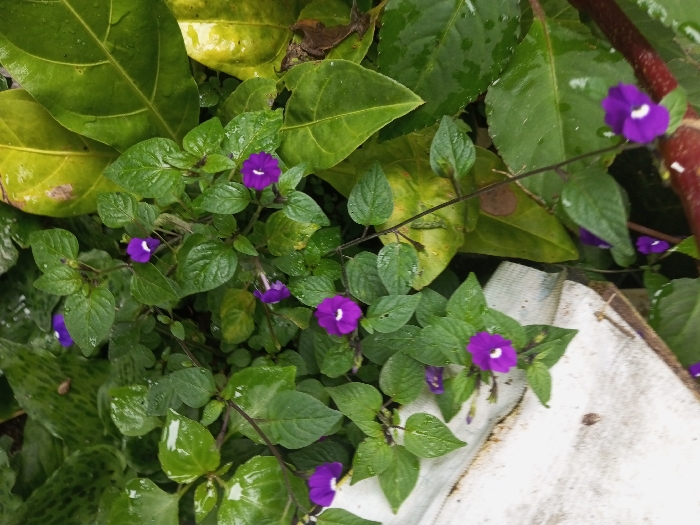 A cluster of purple flowers with white centers grows amidst lush green foliage. The leaves are heart-shaped and glossy, showing signs of recent rain. Some larger, yellowing leaves are also visible, suggesting a backdrop of different plant species. The flowers are delicate and scattered, connected by thin, dark stems. The scene is bathed in natural light, creating a vibrant and slightly wet atmosphere. A small portion of a white surface is also present in the scene.
