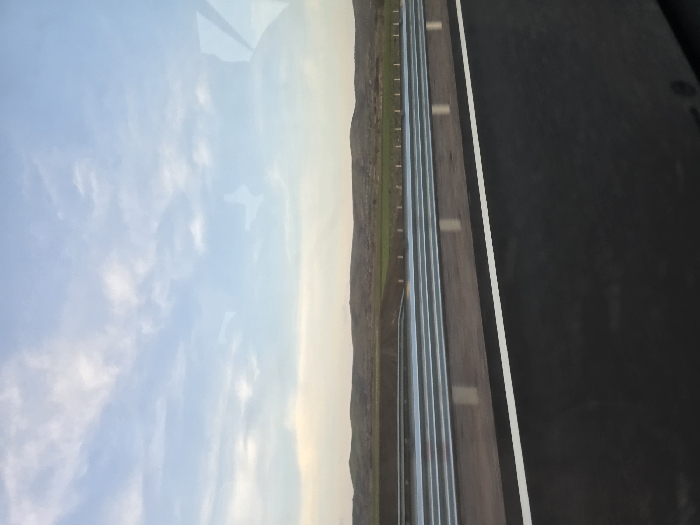 The image depicts an exterior view of a highway near Chokoba, Bulgaria, observed from inside a moving vehicle. The foreground shows a dark asphalt road surface with a distinct solid white line marking its edge. In the midground, a series of parallel metallic guardrails on light-colored posts separate the immediate road from the wider landscape. Beyond the guardrails, the background consists of rolling hills with areas of green vegetation and exposed earth, stretching towards a distant horizon. The sky occupies the upper portion of the frame, displaying a light blue hue with scattered white clouds and a pale yellow-orange band near the horizon line, indicative of either sunrise or sunset. Faint, geometric reflections consistent with a vehicle window are visible in the upper right. No individuals or specific actions are discernible.