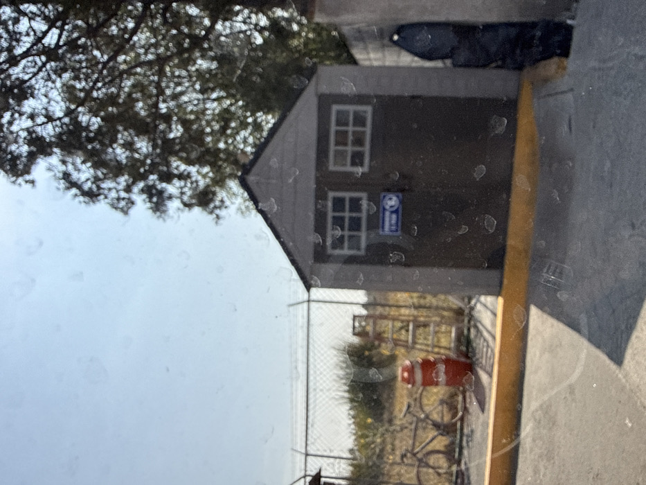 A small building, possibly a shed, has a gabled roof and two windows. A blue sign is placed between the windows. Outside, a chain-link fence runs along the side, partially obscuring a bicycle parked next to a red container. Beyond the fence, vegetation is visible. A tree's branches overhang the building, and a concrete surface runs along the side of the building. The image appears to be taken through a dirty or smudged window.