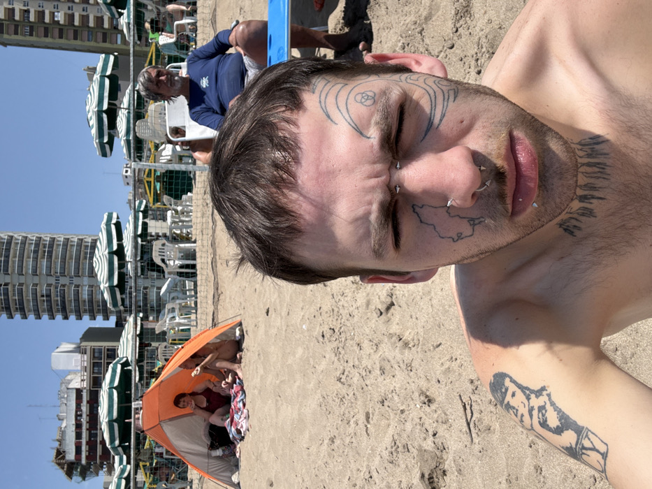 - "A heavily tattooed person with facial piercings lies on a sandy beach" by FM-x5Zlm1, licensed under CC BY 4.0