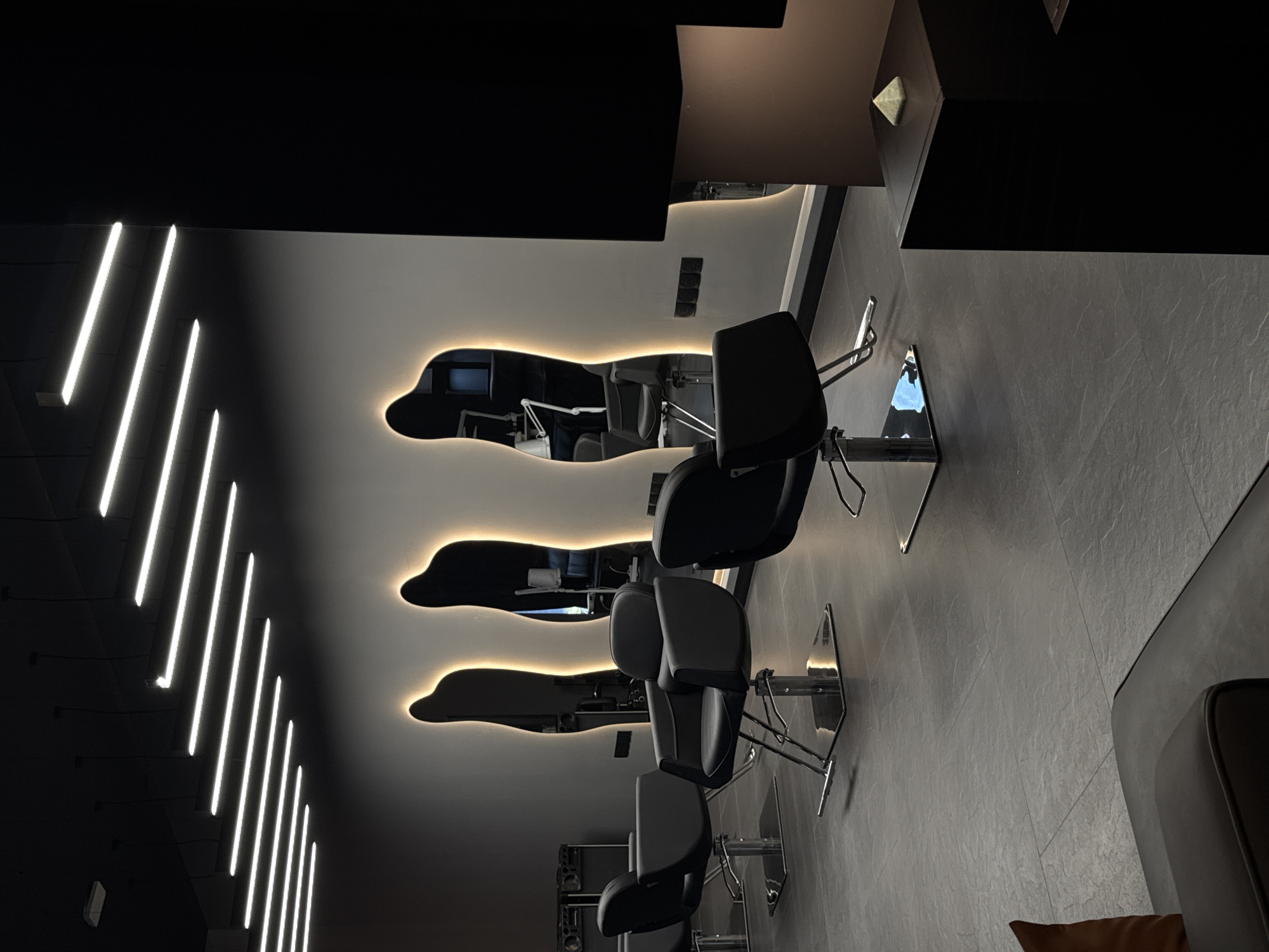 The image displays the interior of a modern, unoccupied hair salon or styling studio located in Choeng Thale, Thailand. The environment features a dark, minimalist design with a dark grey tiled floor and a dark ceiling equipped with multiple rows of suspended linear white LED light fixtures. Along a light grey wall, three distinct, irregularly shaped mirrors are mounted, each encircled by a warm yellow-orange LED backlighting. Four black, upholstered hydraulic styling chairs with chrome bases and footrests are positioned in front of these mirrors; all chairs are empty. In the far left background, dark audio equipment or similar electronic devices are visible on a surface. The right foreground shows a dark, rectangular pedestal or display stand, topped with a small, light-colored, translucent pyramidal object. A warm, downward-directed light source illuminates the lower portion of this pedestal. No individuals or active interactions are present in the scene.