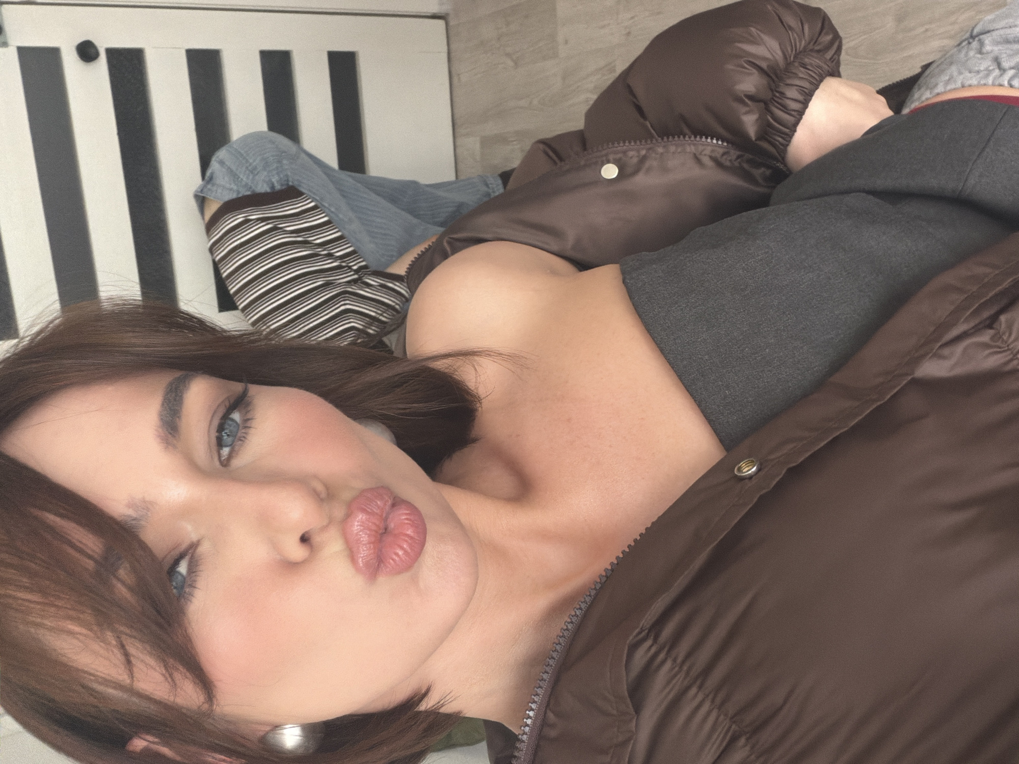 The image displays a close-up, chest-up self-portrait of a young adult female taken indoors in Ust-Ilimsk, Russia. The primary subject has medium brown, shoulder-length hair with bangs, blue eyes, and fair skin with visible blush and lip gloss. She wears a brown puffer jacket, partially unzipped and pulled off her left shoulder, revealing a dark gray strapless garment underneath. A large, spherical, silver-toned earring is present on her left ear. Her lips are puckered in a kissing gesture, and she looks directly at the camera. The background features a white door with five horizontal black stripes. A light-colored wooden or laminate floor is visible in the lower portion of the frame. To the right of the primary subject, an arm clothed in a brown and white striped long-sleeve shirt and a leg clad in blue jeans are partially visible, indicating the presence of a second individual. A light gray garment with a red hem is also discernible in the lower right corner.
