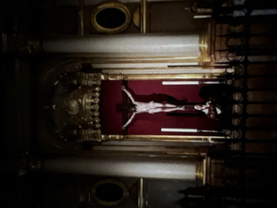 The image displays the dimly lit interior of a church in Dabovo, Bulgaria, focusing on the main altar. Centrally positioned is a large crucifix featuring a light-toned figure of Jesus Christ with outstretched arms, affixed to a dark cross. The crucifix is set against a vibrant red rectangular panel, which is bordered by an elaborate golden altarpiece. The altarpiece includes intricate decorative elements and a radiating sunburst motif at its apex. Below the crucifix, a statue of a static female figure, possibly Mary Magdalene, is depicted holding an object in her hands. Two tall, white taper candles stand upright on either side of the crucifix. The central altarpiece is flanked by two substantial, light-colored columns with ornate golden bases and capitals. To the outer sides of these columns, dark, oval-shaped elements in golden frames are visible, likely unlit religious iconography or architectural features. The foreground features a dark wooden railing or barrier, partially obscuring the lower portion of the altar area. The overall lighting is low, creating a solemn atmosphere and contributing to a slight blur across the scene.