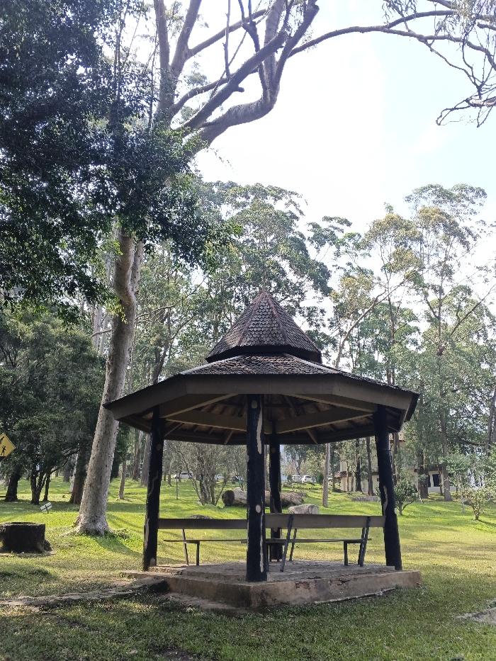 A quaint gazebo with a tiered, dark-shingled roof rests on a concrete base in a grassy park setting. Dark wooden support beams frame built-in benches. The gazebo is surrounded by tall trees, some with exposed roots, creating a shaded area. A sign with a pedestrian symbol is visible in the background. The scene exudes tranquility and nature.