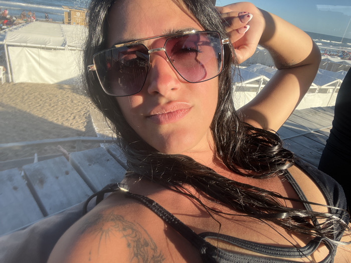 A woman with dark hair and sunglasses poses in a close-up selfie. She is wearing a black bikini top. Her wet hair is slicked back. Behind her is a beach scene with white tents and people near the ocean. The background is bathed in sunlight.