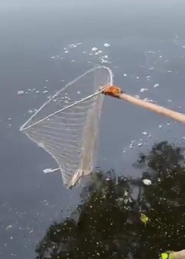 A small white fish is held in a net with a wooden handle, suspended above dark water. The net is made of a light-colored mesh. The water has some algae and small white debris floating on the surface, and reflections of trees are visible. The video seems to be taken from the edge of the water.