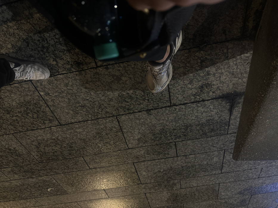 The image depicts a ground-level, top-down view of a paved area in Mexico City, Mexico, under artificial lighting. The surface consists of rectangular, speckled grey granite-like tiles with dark grout lines. Two individuals are partially visible from the knees down. One individual, located at the top of the frame, wears dark trousers and light grey athletic shoes with dark soles. The second individual, on the right side of the frame, wears dark trousers and silver-toned athletic shoes. This individual holds a dark bag, inside which a plastic water bottle with a green cap is partially visible. A segment of a low, dark, textured barrier or curb extends across the lower foreground. Artificial light sources create distinct reflections and shadows on the tiled surface. No direct interaction between the individuals is discernible; they appear to be standing or walking in proximity.