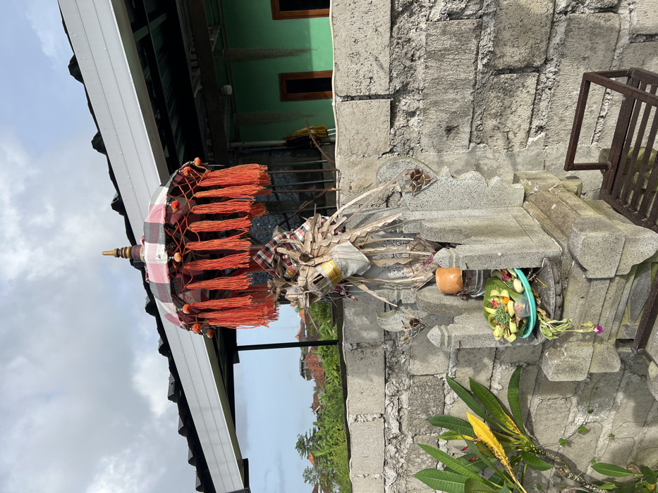 A Balinese Hindu shrine sits against a stone wall, adorned with offerings of flowers, fruits, and green leafy materials in a round container. Above the shrine, a colorful parasol with orange fringe and a checkered pattern is visible. The surrounding environment includes a green building in the background, a metal structure, and vibrant yellow and green foliage in the foreground. The sky is overcast.