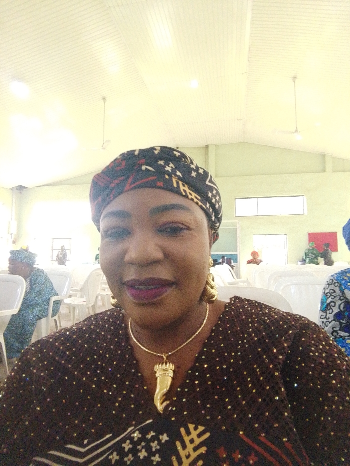 An indoor selfie captures a woman with medium-dark skin, a slight smile revealing upper dental braces, and dark red lipstick. She wears a black, red, and gold/white patterned headwrap, large gold-colored drop earrings, and a dark brown garment adorned with numerous small gold sequins. A gold-colored chain necklace with a prominent gold horn-shaped pendant is visible around her neck. The background is a large hall with light green walls and a white, paneled, vaulted ceiling equipped with fluorescent lighting and two visible ceiling fans. Multiple rows of white plastic chairs are arranged, with several out-of-focus individuals present. A woman in a blue patterned outfit and headwrap is seated to the left. High windows are visible on the back wall, and decorative objects, including red and green figures, are on a surface in the far right background. The event takes place in the city of Unknown, Unknown.