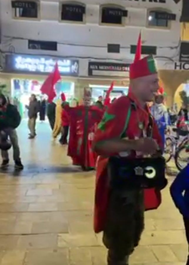 The video depicts a festive atmosphere in what appears to be a public square, possibly at night. A group of people are celebrating, several of whom are carrying or wearing Moroccan flags, dressed in red capes with green trim, and ornate hats. One man, also dressed in a similar red robe and hat, carries two flags, raising and waving them. He appears to be dancing or celebrating, and there is music playing in the background. The group is surrounded by other individuals, some dressed casually, who are observing the celebration. Behind them, a building is labeled "Hotel du Centre," and there are other shops with lit signs. The ground is paved with stone tiles. The atmosphere is lively and celebratory.