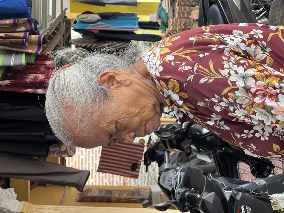 An elderly female is depicted in profile, facing left, with a contemplative or downward gaze in a semi-open outdoor setting in Wedarijaksa, Indonesia