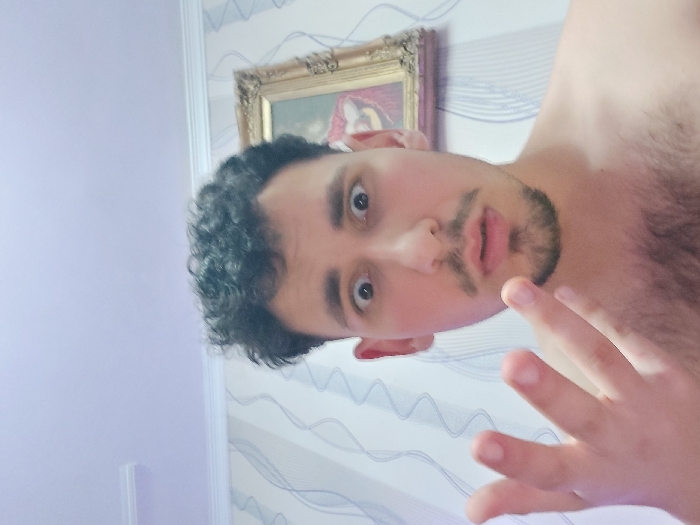 The image displays an indoor scene located in Gorna Oryahovitsa, Bulgaria. An adult male is centered in the frame, facing the camera directly. He is bare-chested, revealing dark curly hair, a mustache, a goatee, and dark chest hair. His eyes are wide open, and his mouth is slightly agape with pursed lips, conveying an expression of apparent surprise or bewilderment. The subject's right hand (from his perspective) is raised to the left side of the frame, with fingers splayed and slightly bent, palm facing forward. The background features a wall adorned with light-colored wallpaper that exhibits a subtle, wavy, blue-grey linear pattern. An ornate, gold-framed picture, containing what appears to be a classical painting with a figure in red drapery, is partially visible on the upper right portion of the wall. The ceiling above is light purple, bordered by a white decorative trim. An elongated white light fixture is affixed to the ceiling in the upper left corner of the frame.