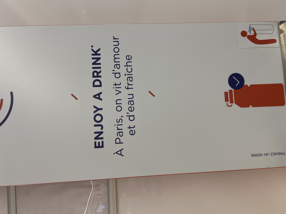 - "A sign reads "ENJOY A DRINK*" followed by the French phrase "À Paris, on vit d'amour et d'eau fraîche" (In Paris, we live on love and fresh water)" by FM-RPGCC2, licensed under CC BY 4.0