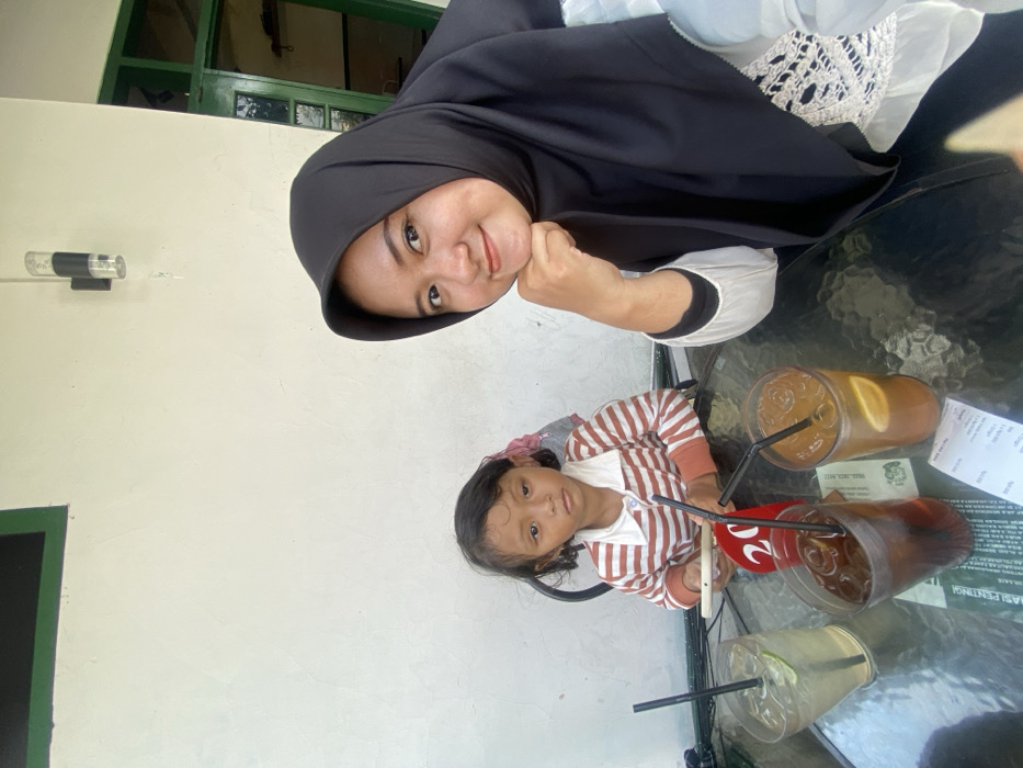 A woman wearing a black hijab poses with her head propped on her hand. Beside her, a young child in a striped shirt sits at a table. Three drinks with straws are visible, two are brown-toned and the other is a lighter color with a lime wedge. A menu or receipt sits beside the drinks on the glass table. The scene is outdoors, with glimpses of a wall and window behind them.