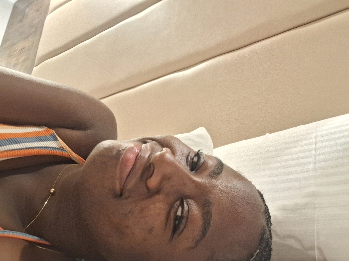 A person lies on a white pillow, presumably in bed. The headboard is light beige with horizontal padded sections. The individual has dark skin and wears a striped orange, blue, and white top. A delicate gold necklace is visible on the neck. The person gazes at the camera with a slight smile.