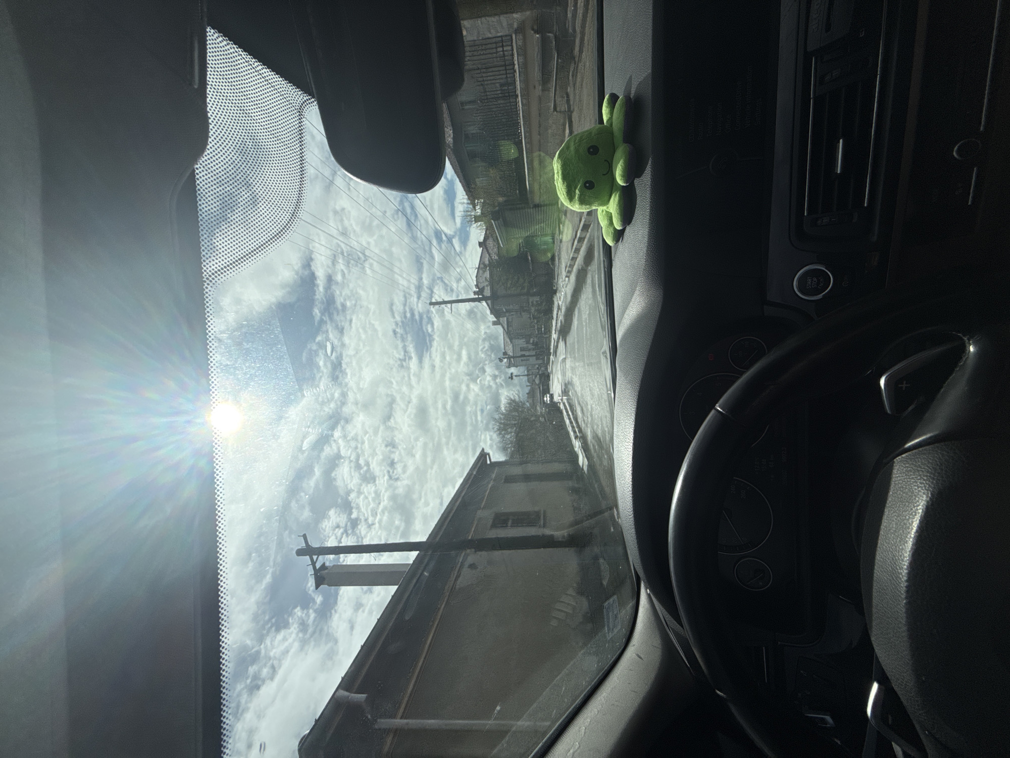 The image depicts an interior view from the driver's seat of a car, looking out through the windshield. Outside, the scene shows a street in Dobrich, Bulgaria with buildings, utility poles, and cloudy sky. The sun shines brightly, causing lens flare on the windshield. A green octopus plush toy sits on the dashboard. The car's steering wheel, dashboard, and other interior features are visible.