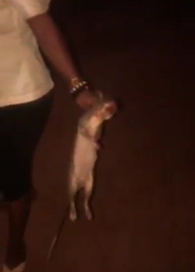 A woman stands on dirt in the dark, holding a dead rat by its hind legs