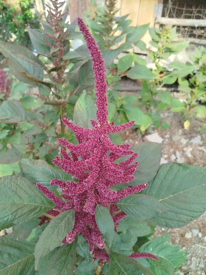 A vibrant amaranth plant displays long, drooping, crimson flower spikes. The dense flowerheads have a distinctive, almost fuzzy texture. Large, dark green leaves provide a contrasting backdrop. Additional similar plants, some with emerging flower spikes, fill the background. The plants thrive outdoors in a garden setting. A wooden structure is visible in the distance.