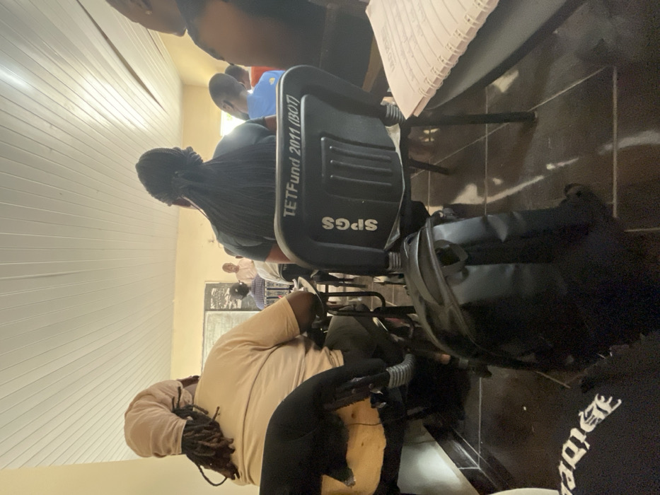 The image depicts an indoor classroom or lecture setting in Jos, Nigeria, viewed from a low-angle perspective at the rear of the room, looking towards the front. Approximately ten individuals are visible, primarily seated and facing forward. In the immediate foreground, a black backpack rests on a dark tiled floor. To its right, a white spiral-bound notebook with faint writing is positioned on a desk surface. The two most prominent figures in the mid-ground are seated with their backs to the viewer. The person on the left has dreadlocks secured with a light-colored headwrap and wears a light short-sleeved top. The person on the right has long, dark braided hair and wears a dark top. This individual is seated in a black plastic chair with a metal frame, the backrest of which features white text: "TETFund 2011 (BOT)" and "SPGS" written vertically. Further towards the front of the room, several other individuals are seated, mostly obscured from full view. One person, presumably an instructor or speaker, stands or sits at the front, facing the seated group, wearing a light-colored shirt. A dark rectangular board, likely a blackboard or whiteboard, is mounted on the light-colored wall at the front of the room, to the left of the speaker. The room features pale yellow walls, a white PVC panel ceiling with horizontal seams, and a dark tiled floor. The overall scene suggests an educational or training session in progress.
