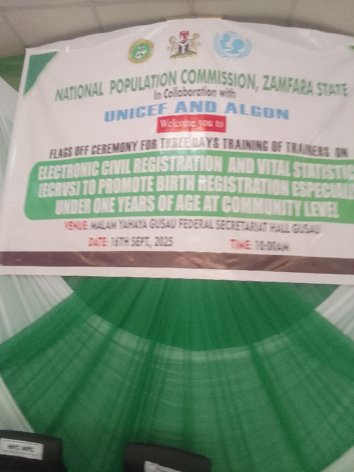 The image depicts an indoor event setting, dominated by a large banner suspended from above. The banner, primarily white with green and brown sections, displays text identifying an event organized by the National Population Commission, Zamfara State, in collaboration with UNICEF and ALGON. The event is a "FLAGS OFF CEREMONY FOR THREE DAYS TRAINING OF TRAINERS ON ELECTRONIC CIVIL REGISTRATION AND VITAL STATISTICS (ECRVS) TO PROMOTE BIRTH REGISTRATION ESPECIALLY UNDER ONE YEARS OF AGE AT COMMUNITY LEVEL." The venue is specified as "MALAM YAHAYA GUSAU FEDERAL SECRETARIAT HALL GUSAU," with a date of "16TH SEPT, 2025" and a time of "10:00AM." At the top of the banner, three distinct logos are visible: a circular green logo, the Nigerian Coat of Arms, and the UNICEF logo. Below the banner, green and white translucent fabric or drapery hangs vertically, forming a decorative background. In the lower left foreground, the partial top of a black chair and a table are visible. A white sheet of paper, possibly a nameplate or informational sign, is partially visible on the table, bearing the letters "NPC." The overall scene suggests a formal ceremony or training session in a governmental or organizational hall within Gusau, Nigeria. No individuals are visible in the frame.